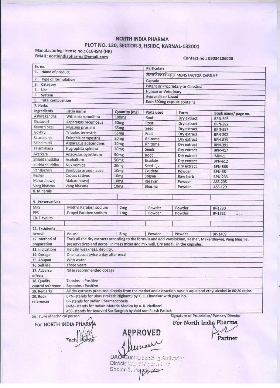 Mens factor Capsules & Oils is made from completely natural and 100% Ayurvedic medicines after extensive research which provides consistent, quick and long lasting results. All our herbal medicines and ingredients are tested in GMP labs and also certified by Ministry of AYUSH, Government of India.